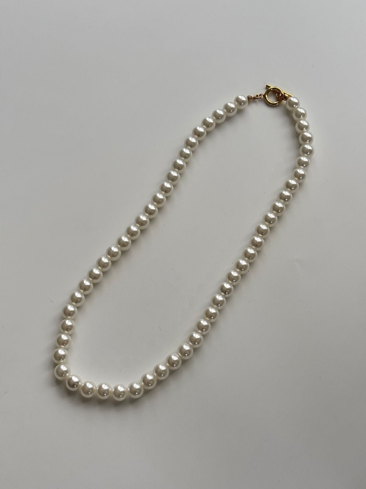 クラシックな一連パールに、モダンなTバー留め具を合わせて“抜け感”をプラス。